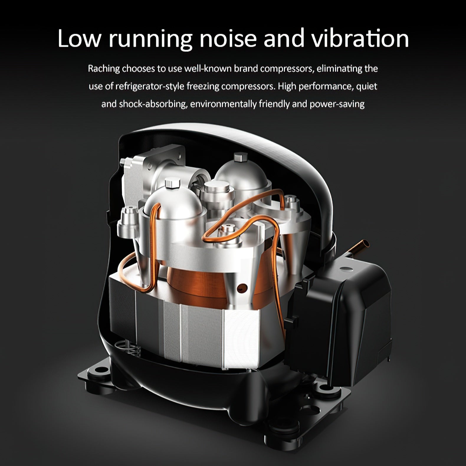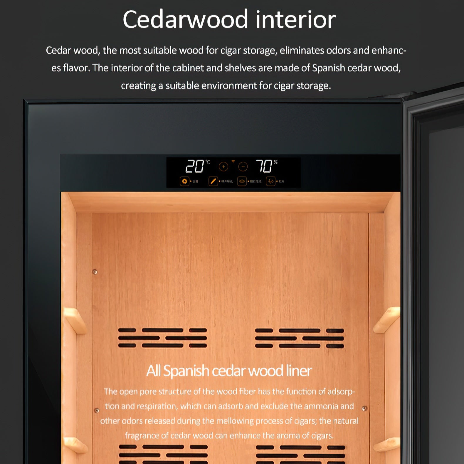 The Raching SD800 Electric Humidor is a luxurious double-door cabinet designed for large cigar collections, with a capacity of 3,000-3,200 cigars. Featuring water-cooling technology, precise temperature and humidity controls, and 16 Spanish cedar wood shelves, this 760L unit in a black walnut finish offers unmatched style and performance.