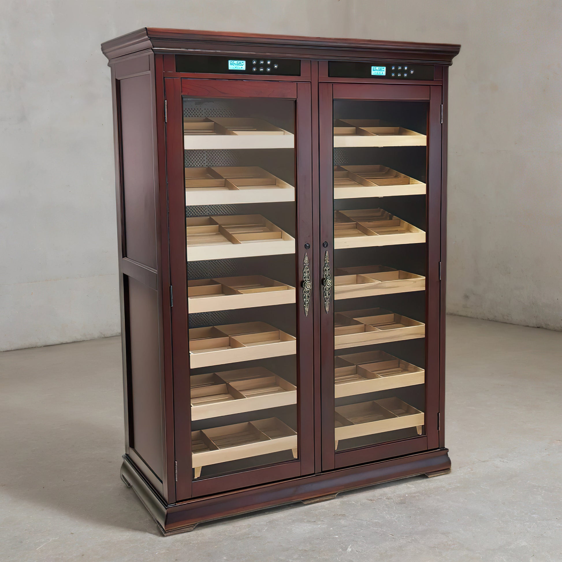 Introducing The Reagan, a large-capacity humidor cabinet designed for serious cigar storage. Finished in a rich dark cherry, this cabinet offers space for up to 4,000 cigars while maintaining stable humidity and temperature throughout the interior. Thoughtful construction and modern control systems work together to support long-term preservation, making The Reagan a practical and refined choice for collectors who want dependable performance in a well-finished cabinet.