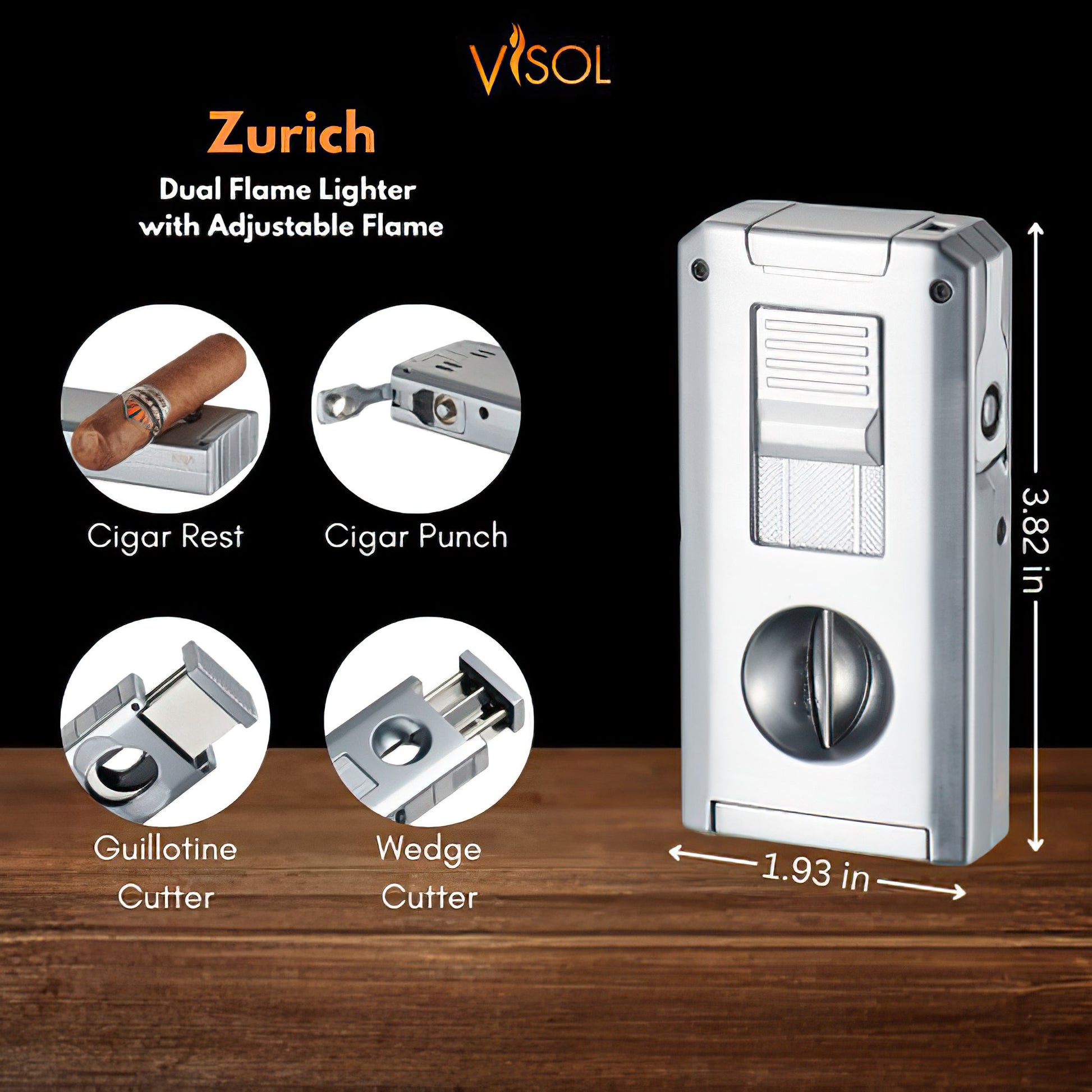 A versatile and stylish dual torch lighter built for serious cigar lovers. The Visol Zurich delivers two powerful flames, a 7mm punch, dual cutters, and a built-in cigar rest, giving you everything you need in one premium silver-finished tool.